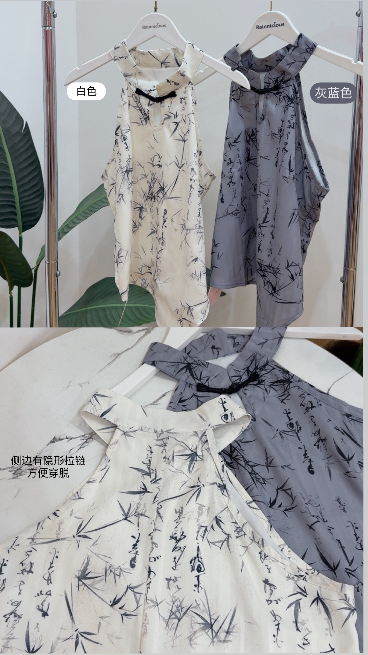 Code:R2878 新中式水墨画挂脖盘扣不规则上衣 Price: Rm39 Color :白色White / 灰蓝色GreyBlue Size : Freesize Bust : 90cm Length : 53-60cm